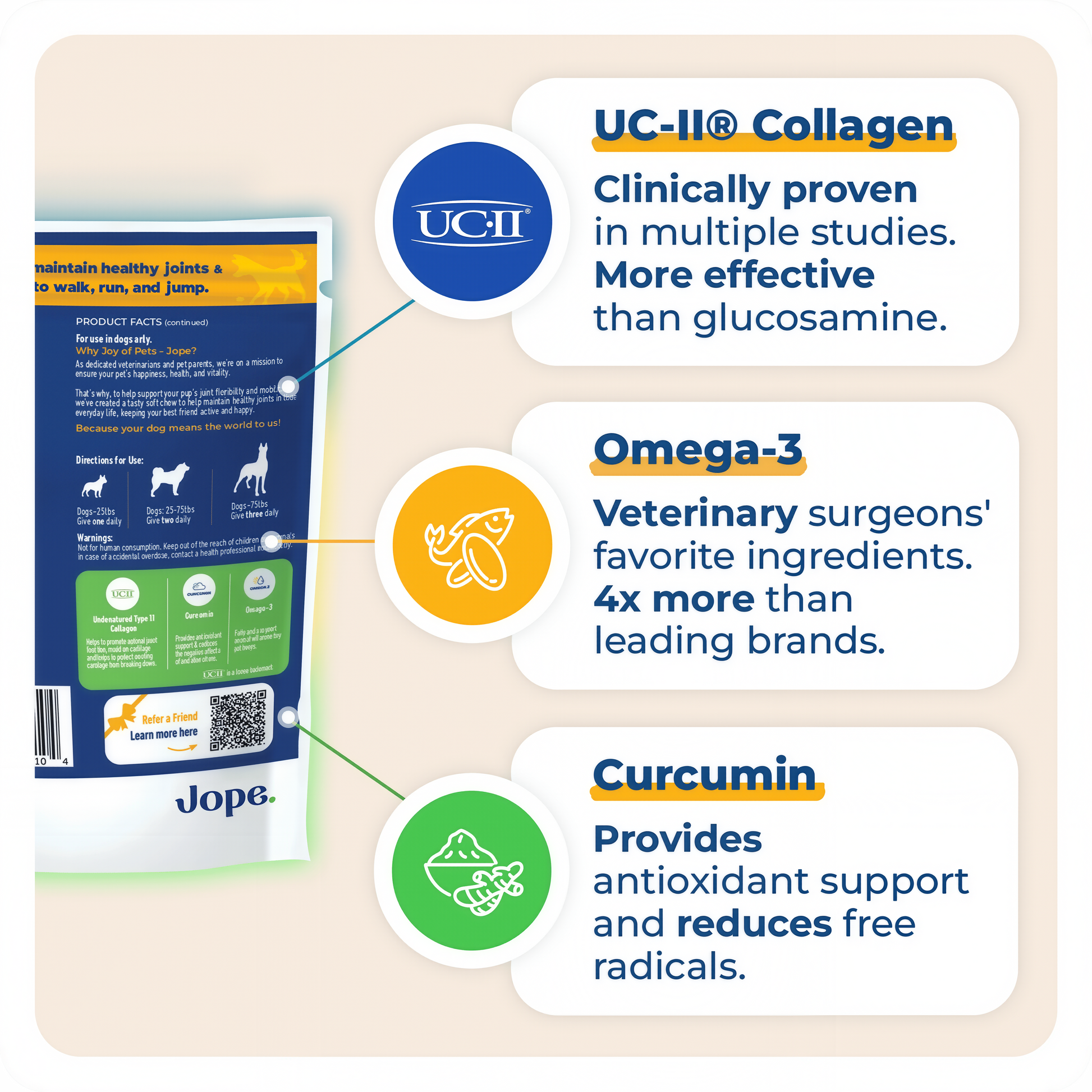 While some vets still recommend glucosamine for dogs, research has shown that ingredients like UC-II® collagen and EPA & DHA are more effective for joint health. More and more vets are switching to Jope from glucosamine-based supplements.