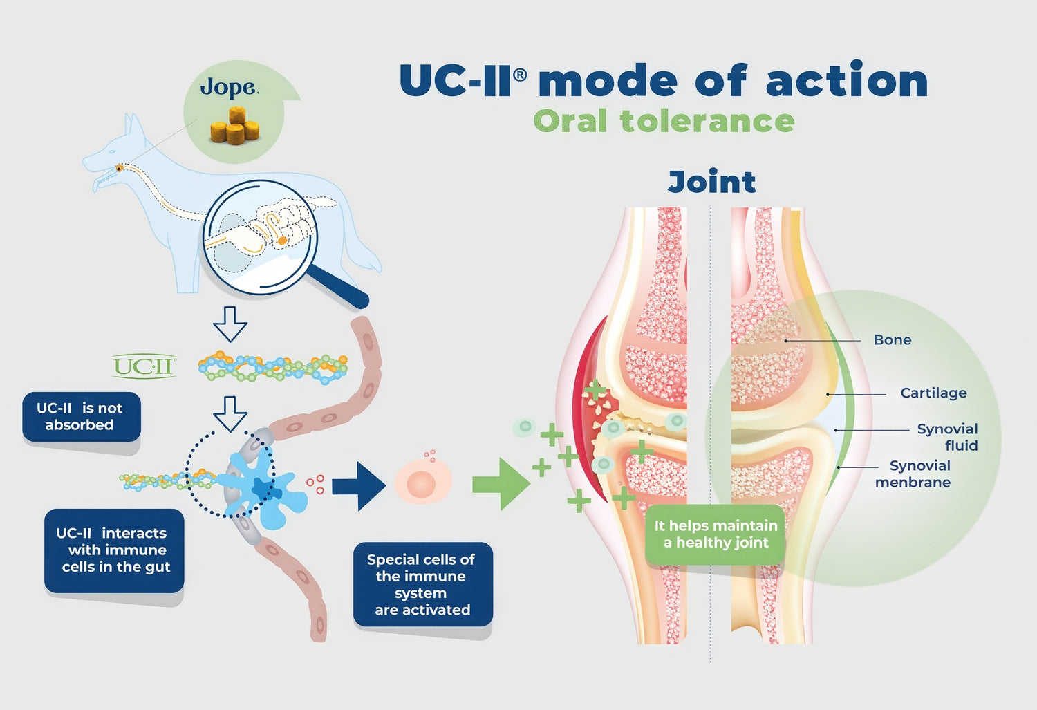 What’s good about these novel ingredients and the formula of Jope Hip & Joint Dog Chews?We know how it works!UC-II’s mode of action is called oral tolerance. And it's amazing.